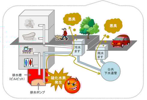 「ミネラルオーシャン」をビルピット・浄化槽にそのまま、またはスラリーで散布することで、ビルの汚水層やレストランの雑排水層の排水から発生する硫化水素が抑制され、悪臭がなくなります。